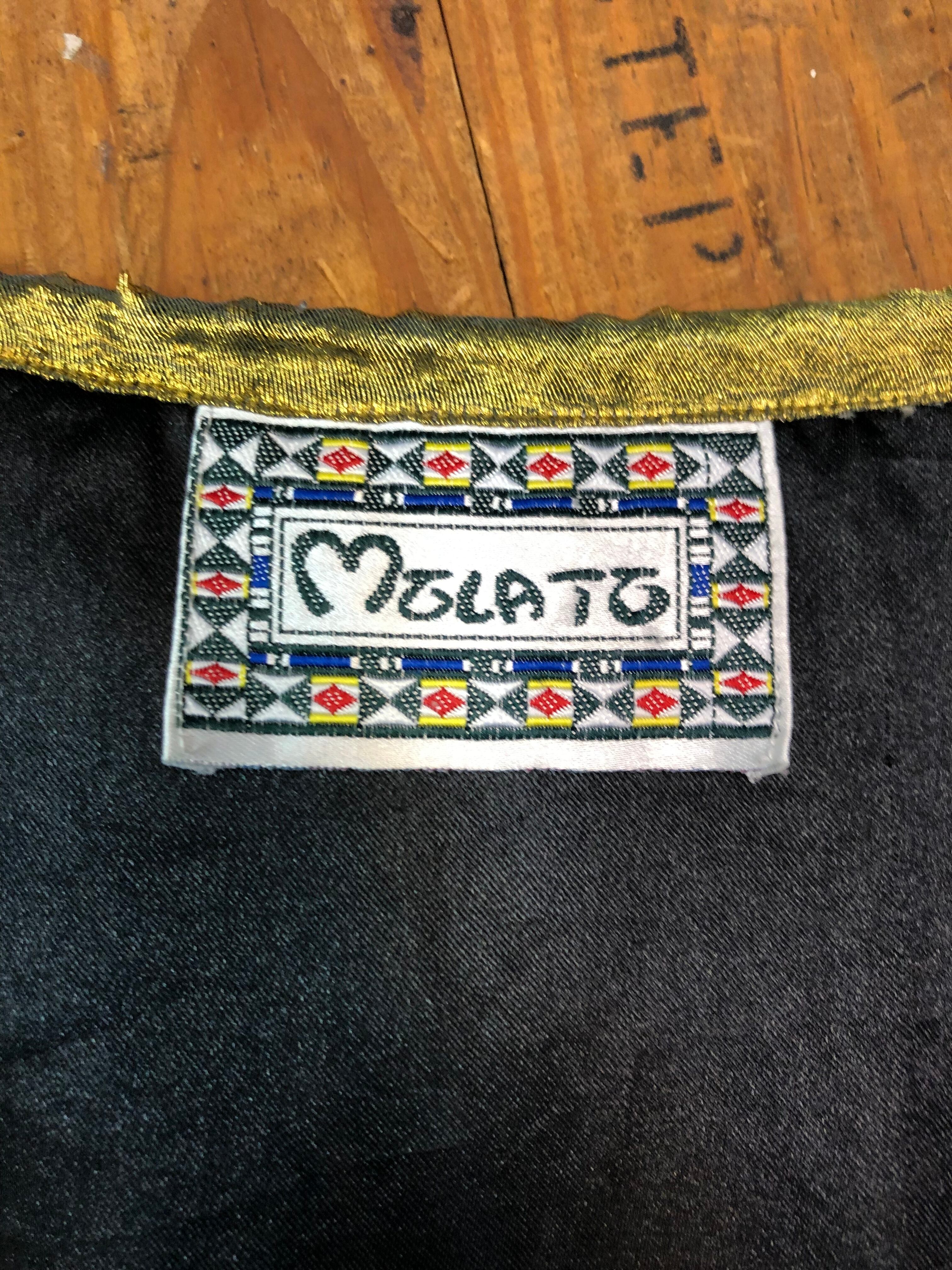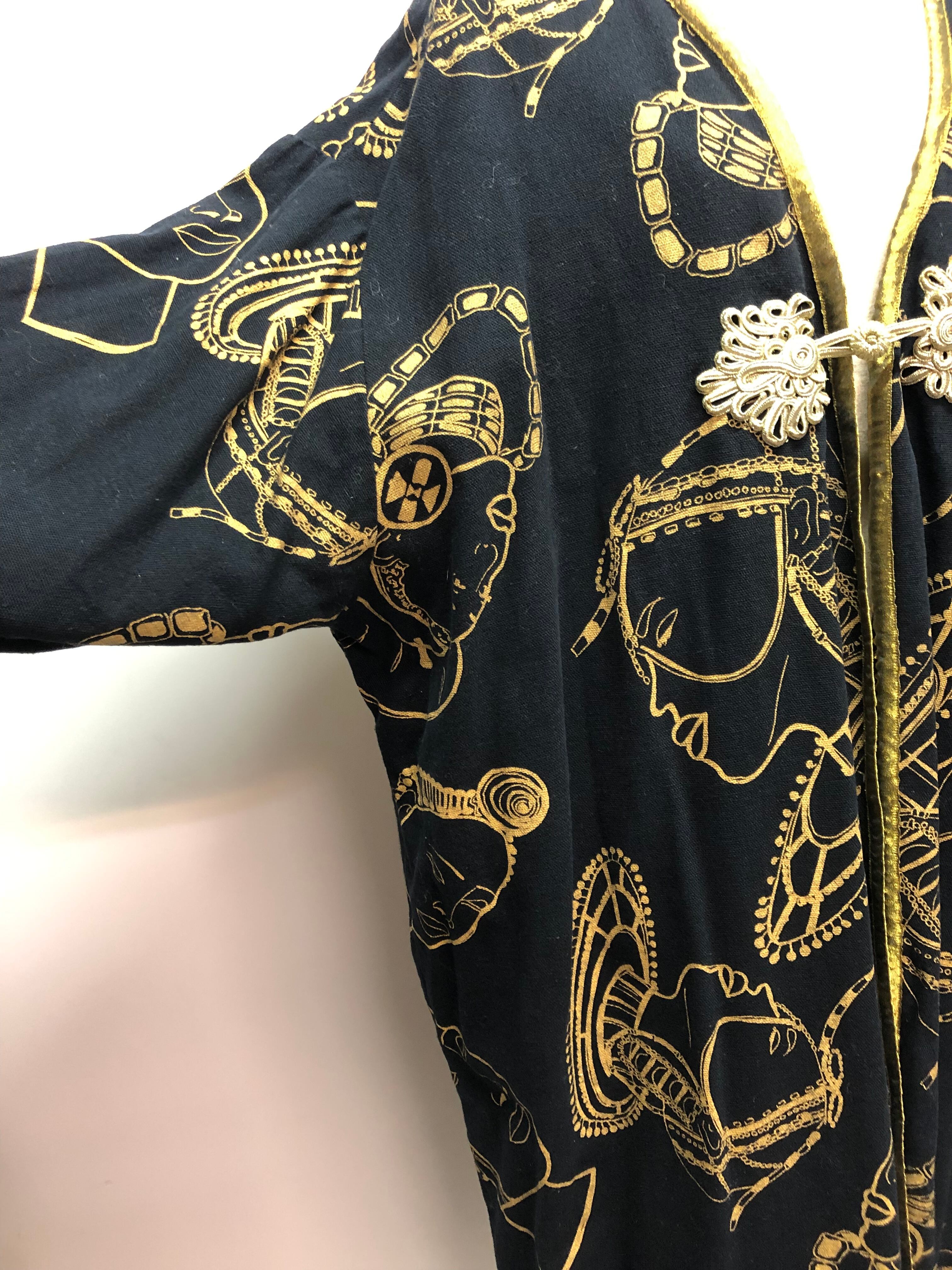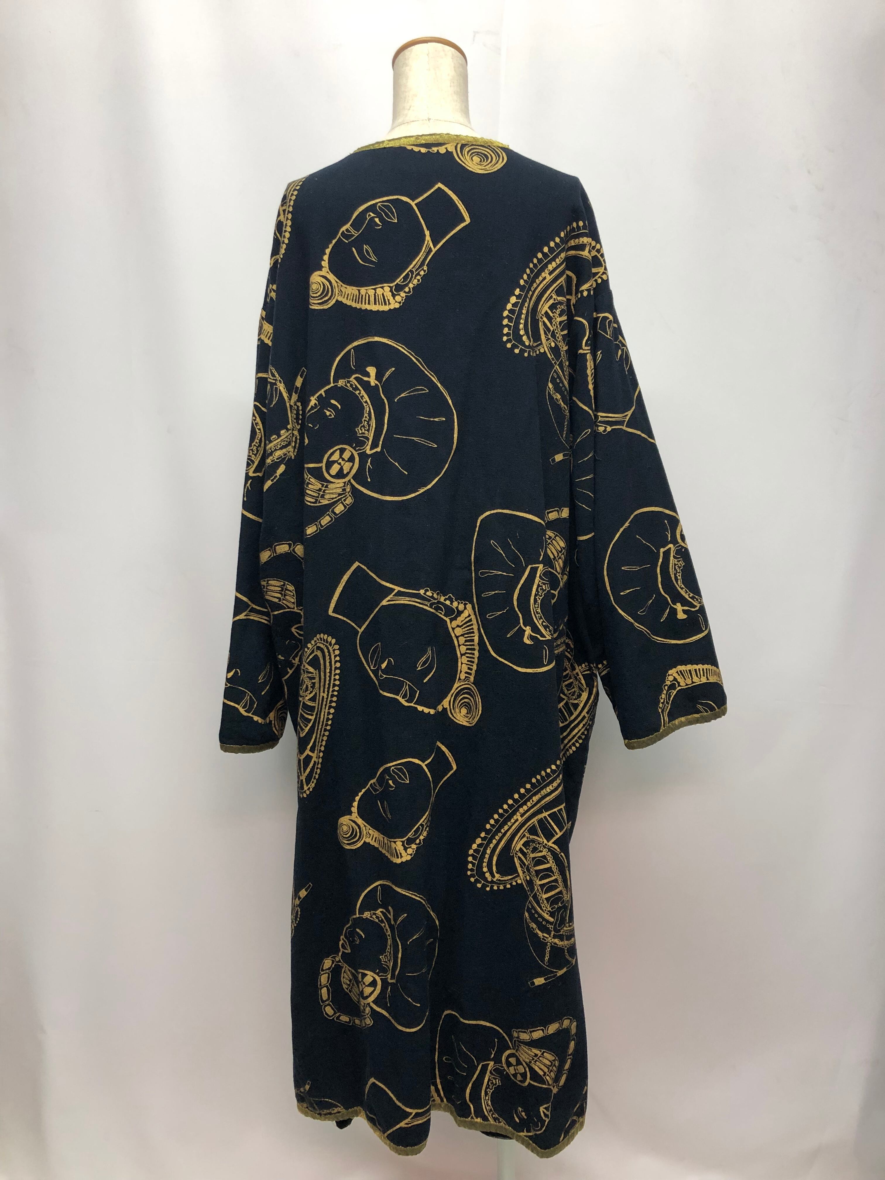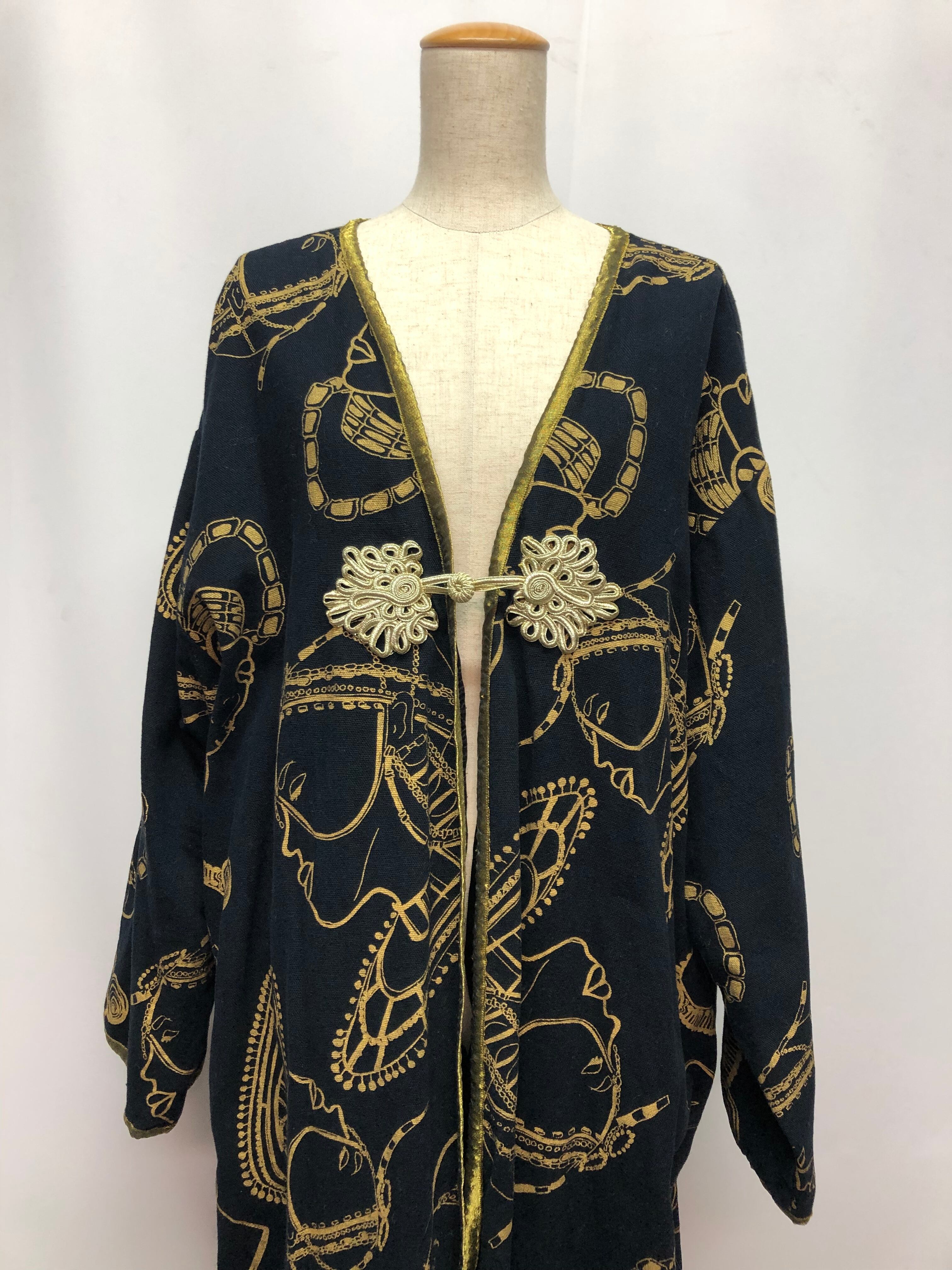 備考:ブラックとゴールドの色合いがコーディネートのカラーを選ばない、万能なコート。胸元のアジアンノットも個性的。描かれているトラディショナルな女性のイラストはヴィンテージらしく見事です。