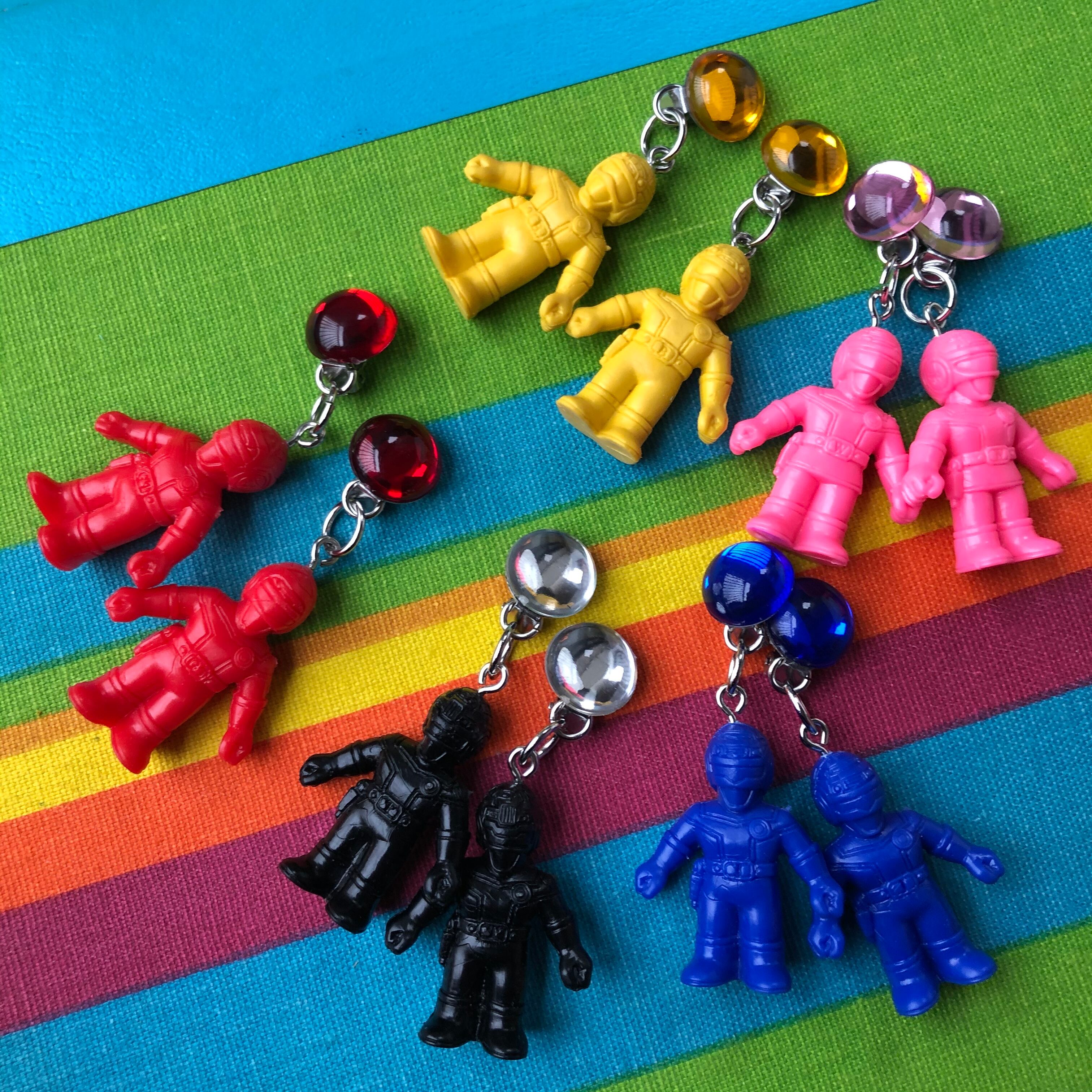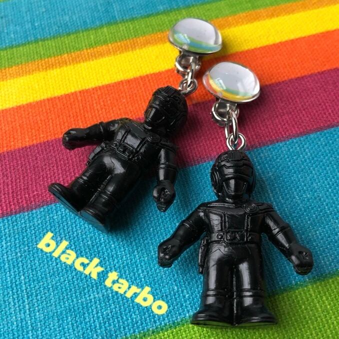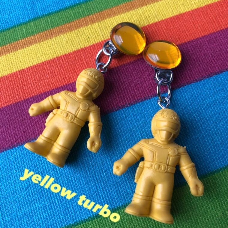 80年代戦隊シリーズ「ターボレンジャー」のフィギュアとビンテージカボションをリワークしたイヤリング。