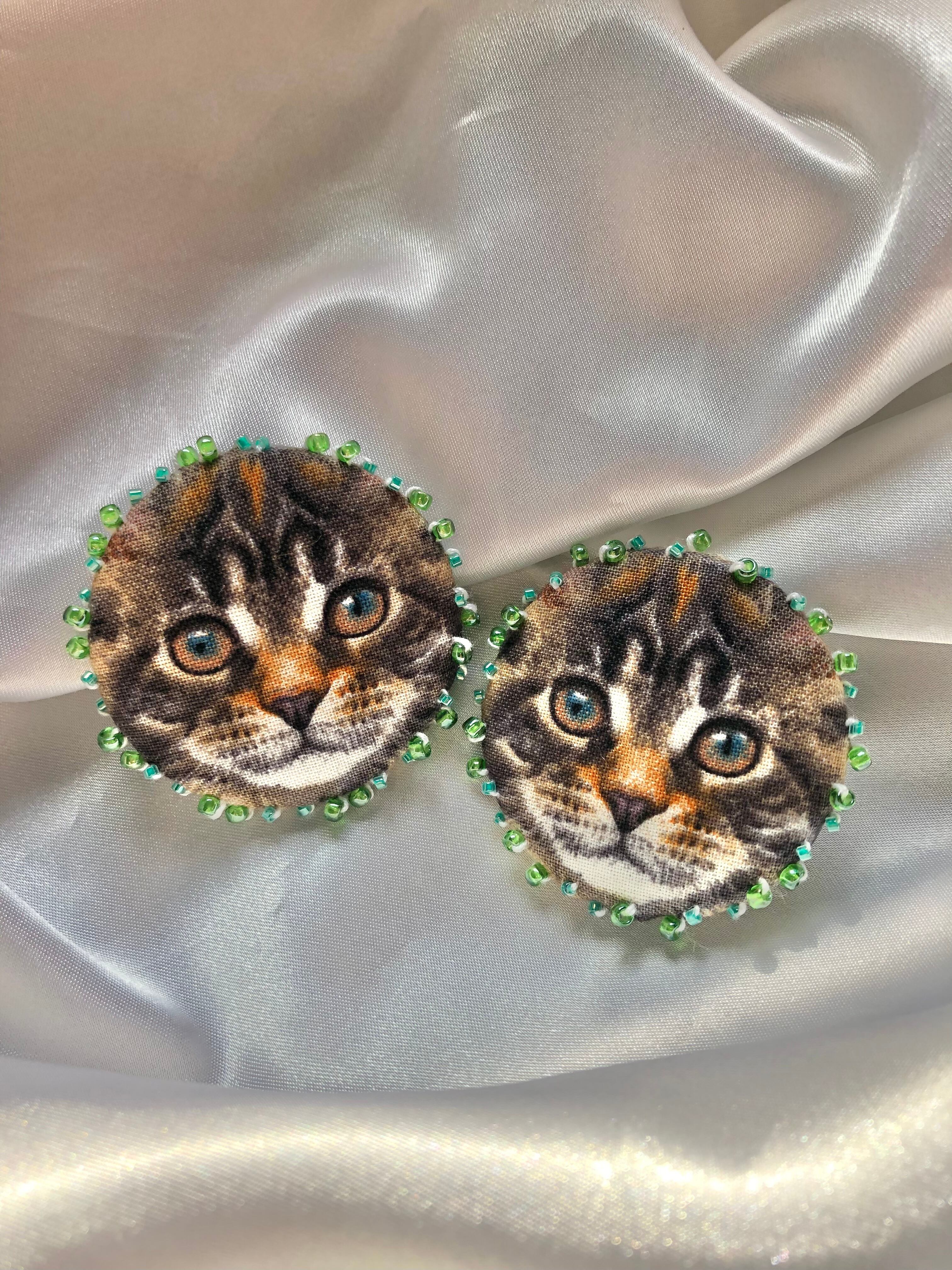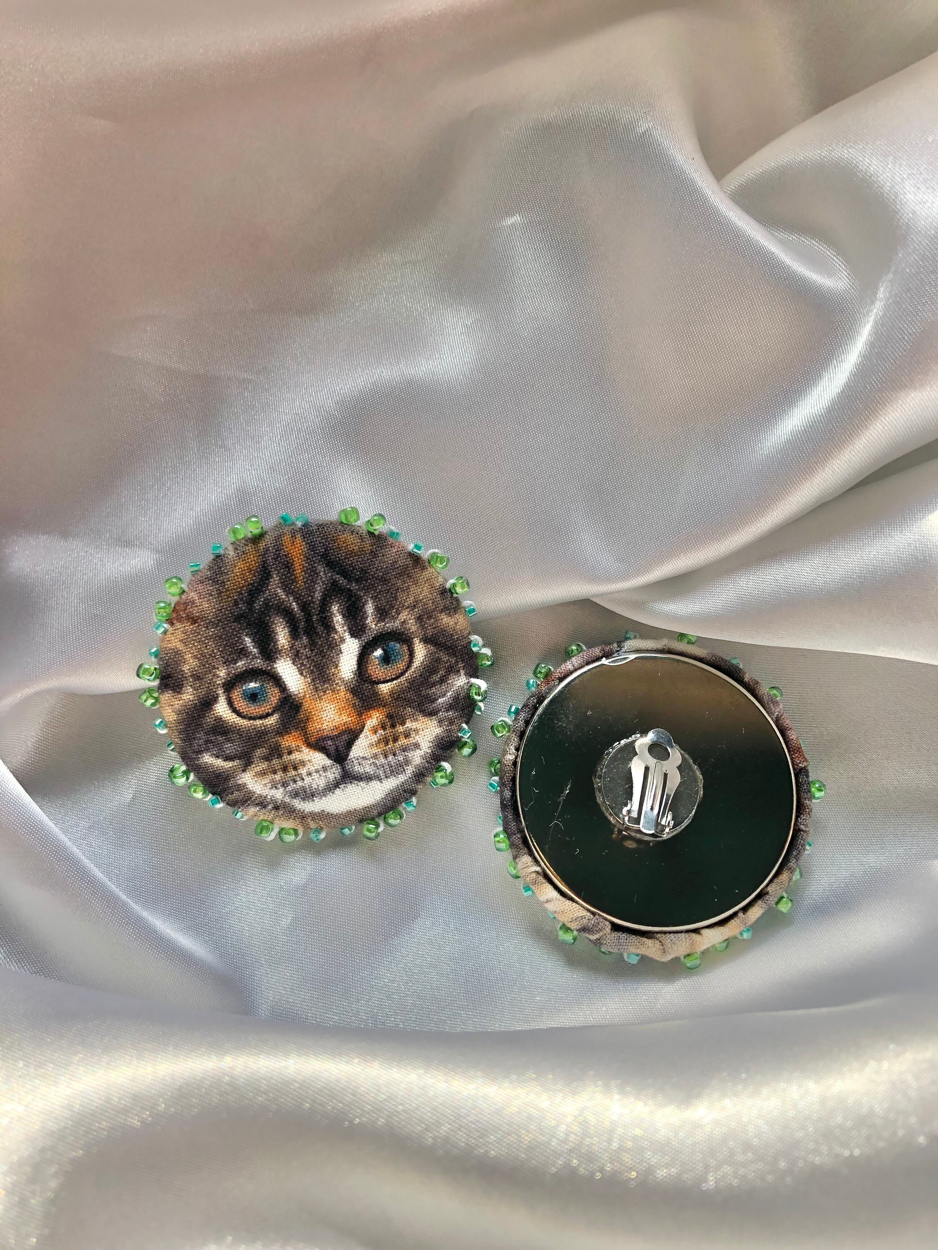 【exclusive】 handmade bead embroidery clip-on-earrings "kitty love" #7 / ヴィンテージ イヤリング 猫 刺繍 | 福狗公司 Foo Dogs Ltd. import vintage boutique