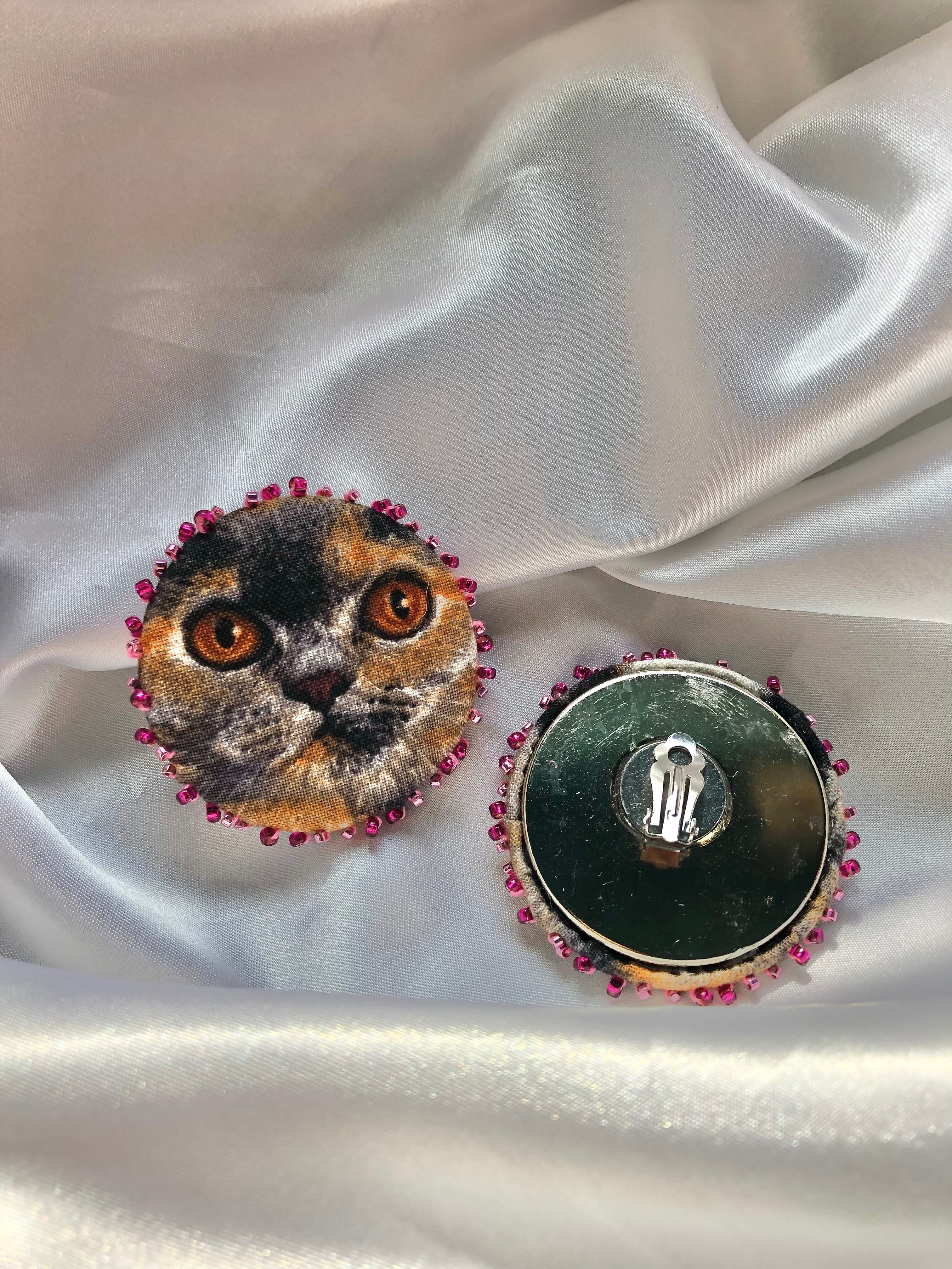 【exclusive】 handmade bead embroidery clip-on-earrings "kitty love" #6 / ヴィンテージ イヤリング 猫 刺繍 | 福狗公司 Foo Dogs Ltd. import vintage boutique