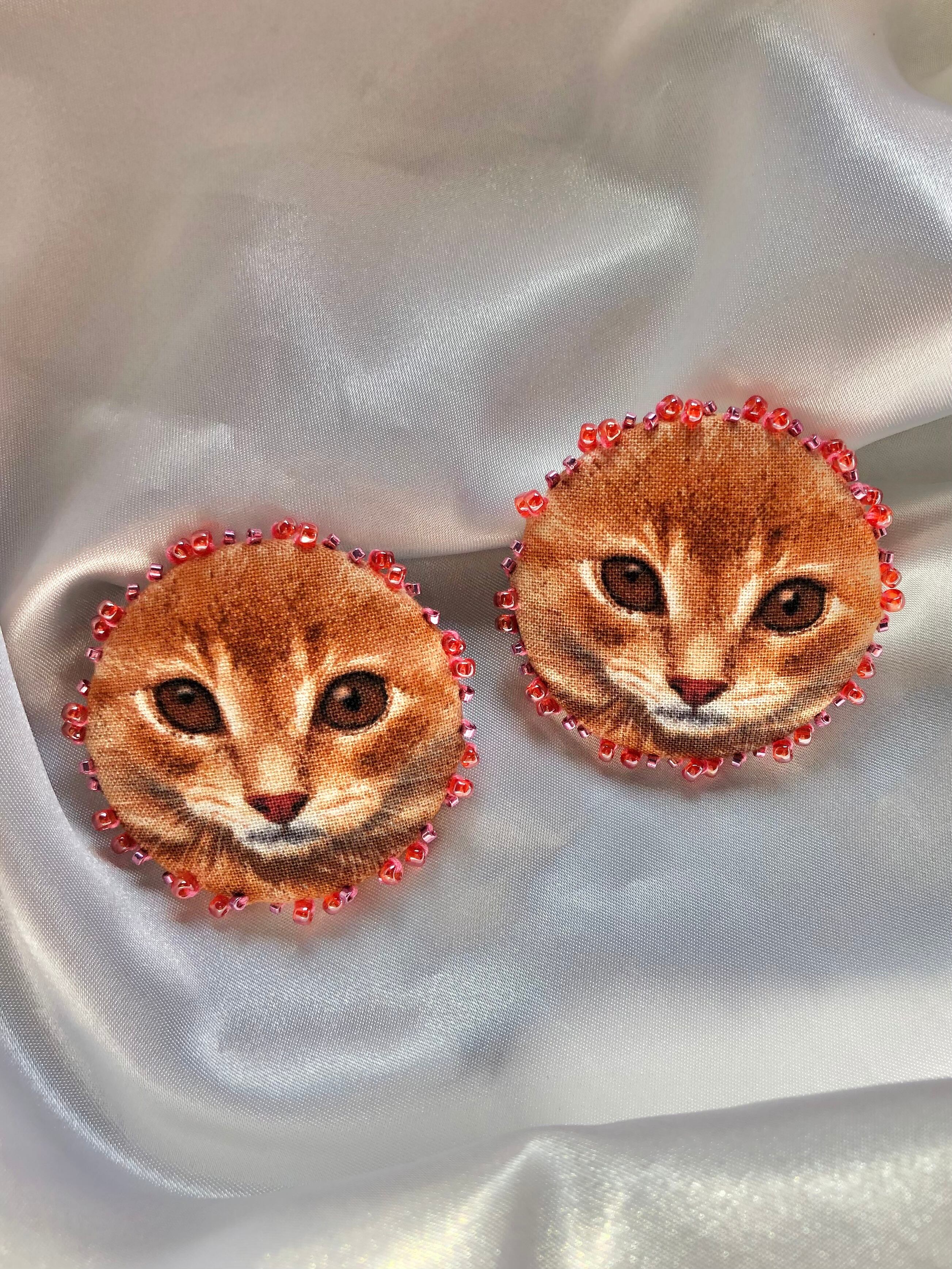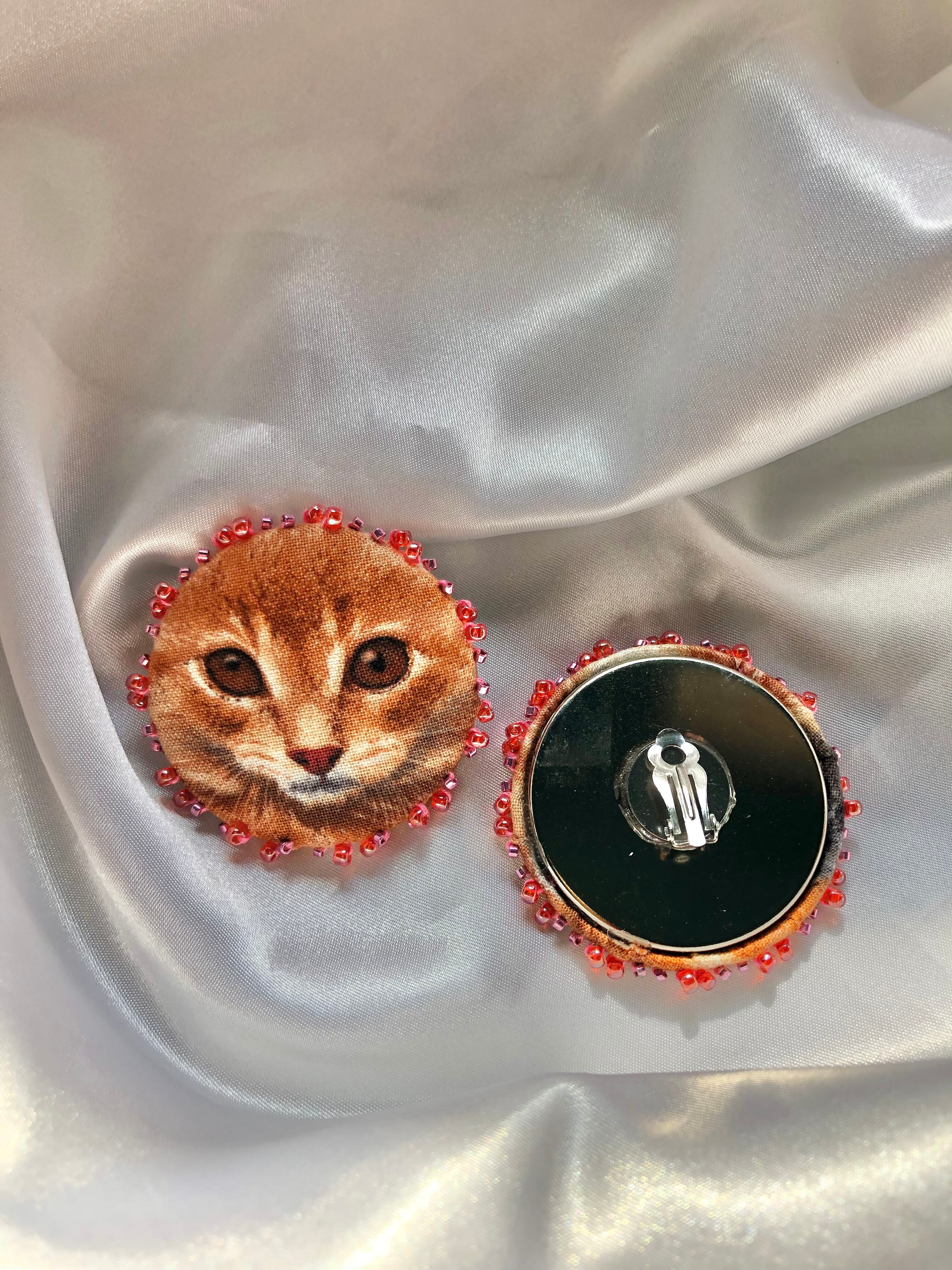 【exclusive】 handmade bead embroidery clip-on-earrings "kitty love" #1 / ヴィンテージ イヤリング 猫 刺繍 | 福狗公司 Foo Dogs Ltd. import vintage boutique