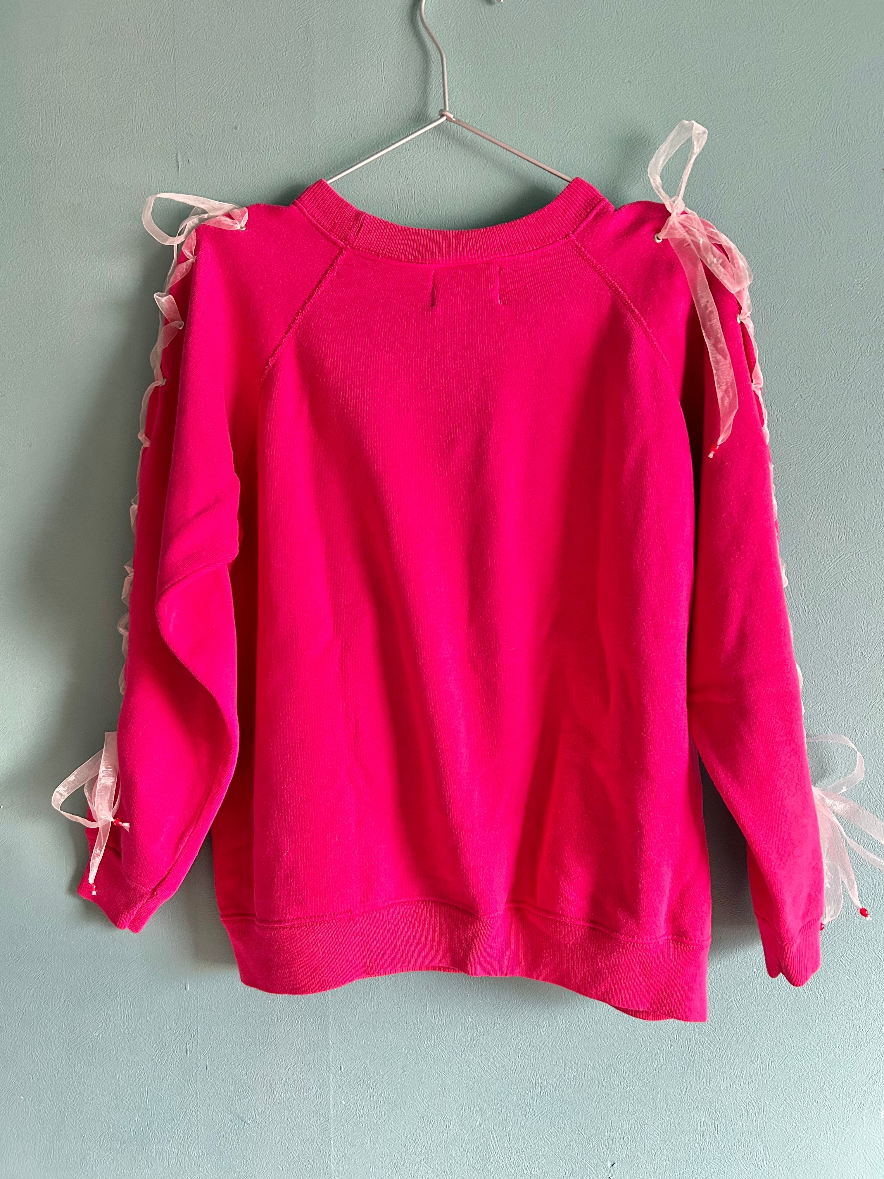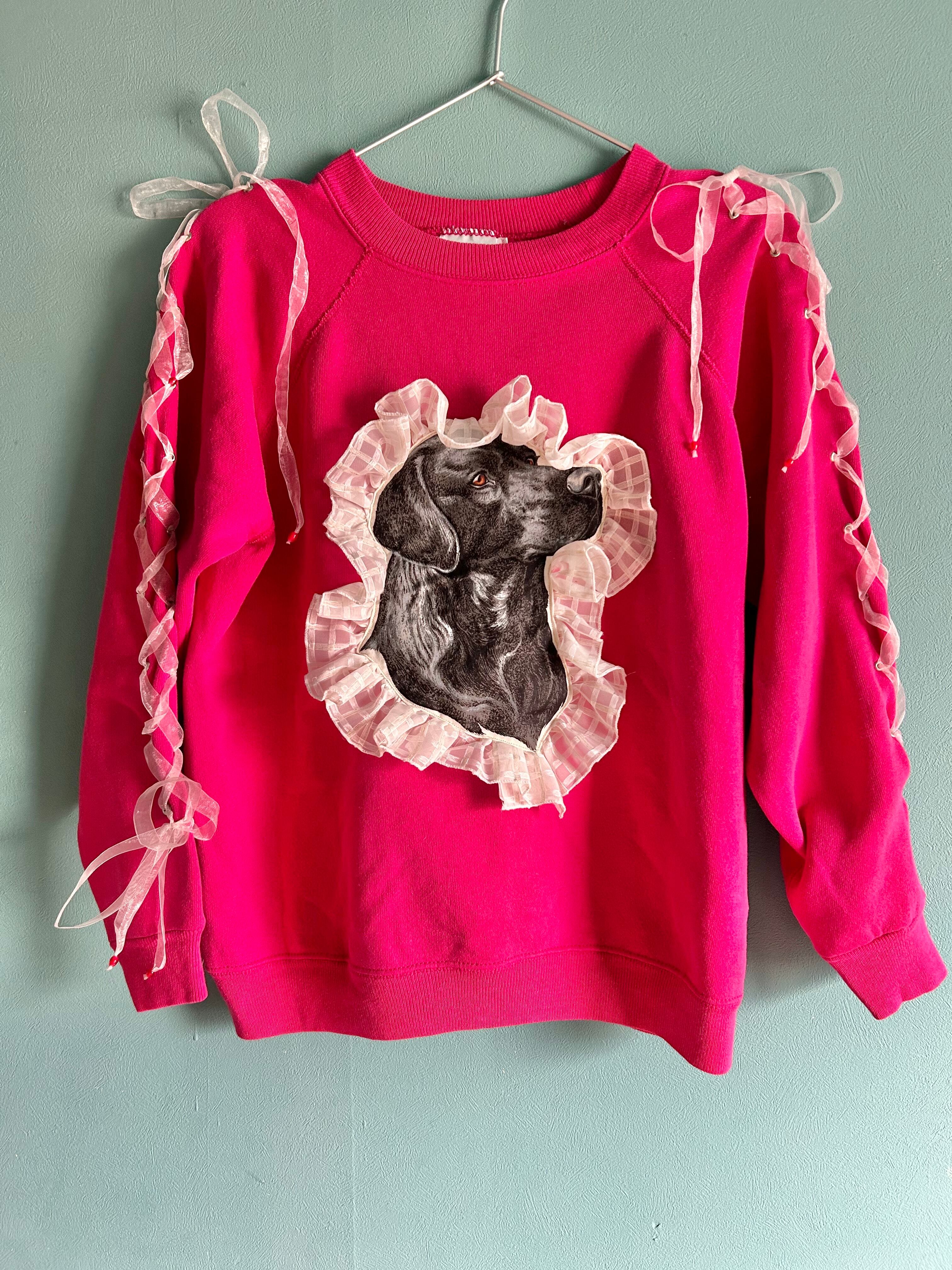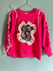 ボディのスウェット・犬のワッペン、共にヴィンテージのものを使用。両袖はシフォンのリボンで編み上げになっています。リボンのエンドパーツも60年代の香港ビーズです。
