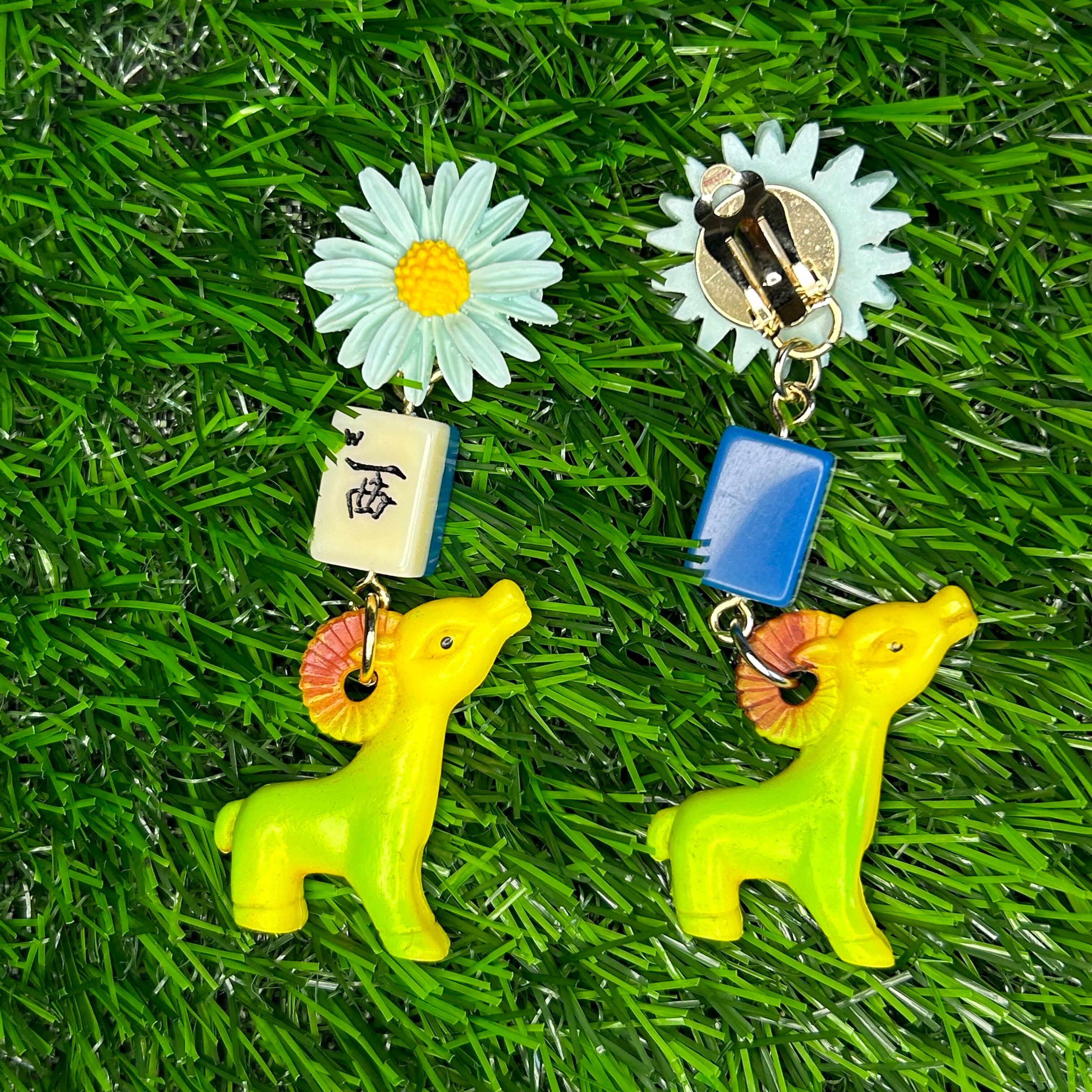 【exclusive】made in hong kong old stock vintage marjong tile rework earrings "sheep(green)" / ヴィンテージ イヤリング 香港 | 福狗公司 Foo Dogs Ltd. import vintage boutique